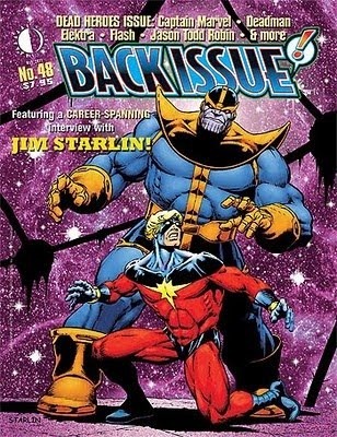Back Issue Nº 48. "Ahora con ocho números por año y 16 páginas a color en cada ejemplar. Este número está dedicado a resucitar a los 'Héroes Muertos'. El hombre detrás de la novela gráfica La muerte del Capitán Marvel, Jim Starlin, opina sobre su remarcable carrera en una entrevista exclusiva. Además: Deadman después de Neal Adams; el Robin Jason Todd; las muertes y resurrecciones de Flash, Elektra, el Batman de Tierra 2; y las muchas muertes de la Tía May. Con ilustraciones y/o comentarios de Jim Aparo, Cary Bates, Gerry Conway, José Luis García-López, Frank Miller, Marv Wolfman y muchos más, junto con una cósmica portada del Capitán Marvel y Thanos a cargo de Jim Starlin. Editada por Michael Eury". Un adelanto puede ser visto en: http://www.twomorrows.com/media/BackIssue48Preview.pdf.