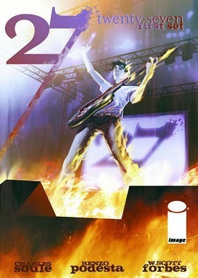 27: First Set. "Los oscuros misterios de la realeza del rock and roll perteneciente al Club 27, quedan revelados en este compilatorio de la exitosa serie de cuatro entregas. Todos los giros, toda la acción, toda la locura, en un bello envoltorio. Lleno de extras, incluyendo una nueva historia complementaria de 12 páginas. Es lo más excitante que pueda pasarte desde los Beatles en Budokan". Por Charles Soule (guión), Renzo Podestá (dibujos) y W. Scott Forbes (portada).