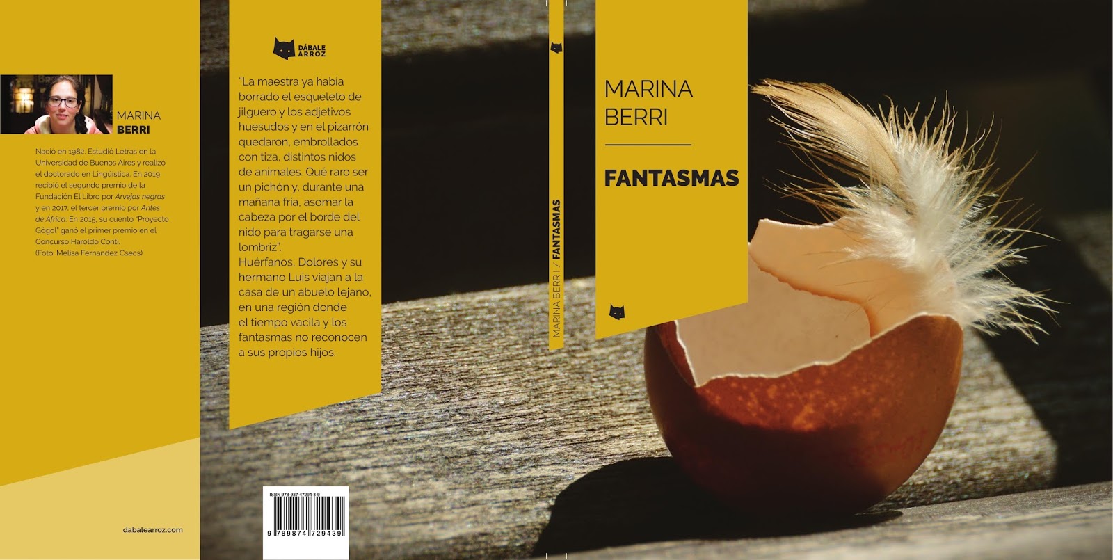 Fantasmas, de Marina Berri.Huérfanos, Dolores y su hermano Luis viajan a la casa de un abuelo lejano, en una región donde el tiempo vacila y se mezcla. Allí, entre tareas escolares y seres de distinta consistencia, intentan detener una revuelta que busca hacer tambalear el orden. El diseño de tapa es de Lucho Andújar. La foto, de Mel Fernandez Csecs. Marina Berri viene de premio en premio. En 2019 recibió el segundo premio de la Fundación El Libro por el libro de cuentos Arvejas negras (próximamente en Dábale Arroz) y en 2017, el tercer premio por Antes de África. En 2015, su cuento Proyecto Gógol ganó el primer premio en el Concurso Haroldo Conti. Nació en 1982. Es doctora en Lingüística. Aquí se puede leer un fragmento de la novela.