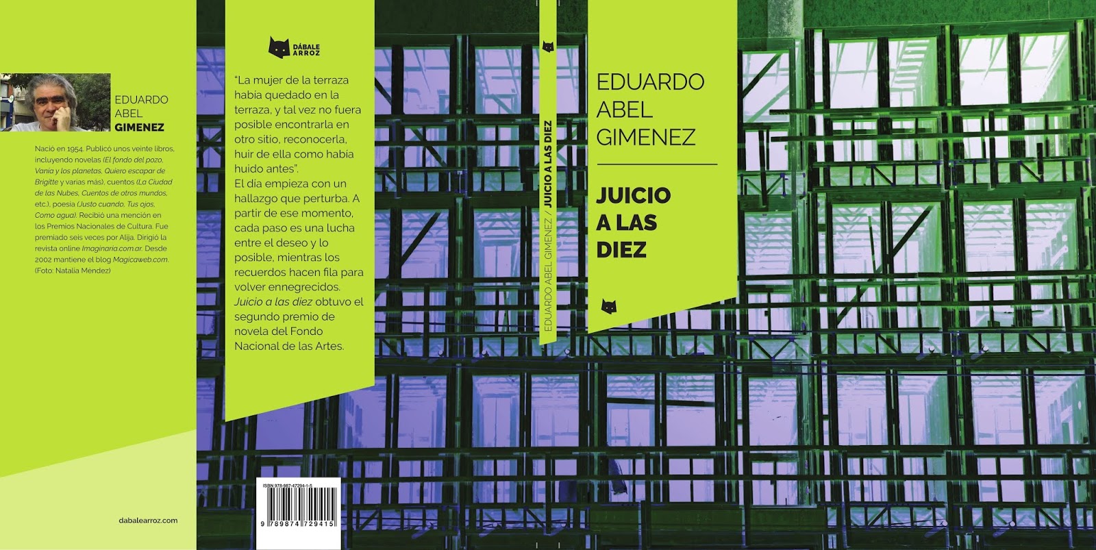 Juicio a las diez, de Eduardo Abel Gimenez.El día empieza con un hallazgo que perturba. A partir de ese momento, cada paso es una lucha entre el deseo y lo posible, mientras los recuerdos hacen fila para volver ennegrecidos. Juicio a las diez obtuvo el segundo premio de novela del Fondo Nacional de las Artes. Contada en primera persona, describe el recorrido del narrador por las calles de su barrio mientras imagina escenarios catastróficos. Luego, cuando vuelve a su casa, el recorrido real y el imaginario se unen en una reconstrucción de su memoria. El diseño de tapa es de Lucho Andújar. Eduardo Abel Gimenez nació en 1954. Publicó unos veinte libros, incluyendo novelas (El fondo del pozo, Vania y los planetas, Quiero escapar de Brigitte y varias más), cuentos (La ciudad de las nubes, Cuentos de otros mundos, etc.), poesía (Justo cuando, Tus ojos, Como agua). Recibió una mención en los Premios Nacionales de Cultura. Fue premiado seis veces por Alija. Dirigió la revista online Imaginaria.com.ar. Desde 2002 mantiene el blog Magicaweb.com. Pueden leer el primer capítulo aquí.