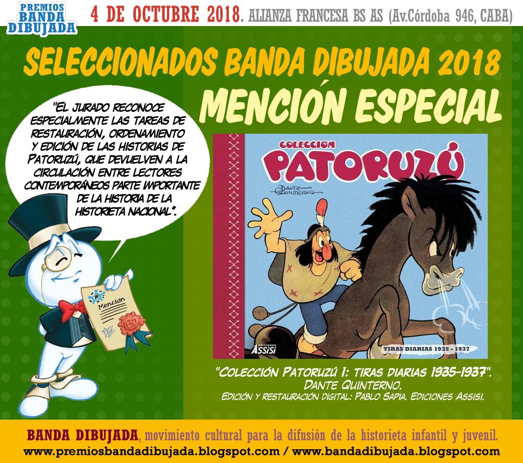 Colección Patoruzú 1: tiras diarias 1935 – 1937, de Dante Quinterno. Edición y restauración digital de Pablo Sapia (Ediciones Assisi). Fundamento del Jurado: Este libro republica por primera vez en forma completa todas las tiras de Patoruzú publicadas en el diario El Mundo entre el 12 de Diciembre de 1935 y el 23 de Septiembre de 1937. Acá está -por fin- la verdadera etapa clásica en la larga historia del popular personaje creado por Dante Quinterno en 1928 y realmente era un sinsentido que nadie rescatara estas historietas en una nueva edición. El libro además incluye varios extras muy interesantes, con valiosa información, historietas raras, ilustraciones increíbles y demás material que hacen que cualquiera que sienta un mínimo interés por Patoruzú, por la obra del Pibe Quinterno o por la historieta argentina clásica lo quiera atesorar para siempre. Puede funcionar perfectamente como un vínculo entre los nuevos lectores, sus padres, sus abuelos y hasta sus bisabuelos, ya que se trata un personaje icónico que atraviesa cuatro generaciones.