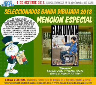 Bakuman, de Tsugumi Ohba y Takeshi Obata (IVREA). Fundamento del Jurado: La editorial Ivrea cumplió con la meta de publicar en la Argentina los 20 tomos que componen Bakuman, el manga escrito por Tsugumi Ohba y dibujado por Takeshi Obata, que muy probablemente sea la mejor historieta infanto-juvenil publicada en el siglo XXI. Con valiosísima data acerca de cómo se producen las revistas de historietas más exitosas del planeta, un elenco repleto de personajes fascinantes, tramas llenas de suspenso y emociones y un dibujo descomunal, Bakuman es lo mejor que le pasó al shonen en su historia. Un manga de amor al manga cuyo único defecto es que, en un momento, se termina.