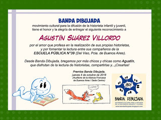 Reconocimiento a Agustín Suárez Villordo, alumno de 5º "B" de la Escuela Pública N° 39 de Del Viso (provincia de Buenos Aires), por el amor que profesa en la realización de sus propias historietas; y por fomentar la lectura entre sus compañeros de la escuela.