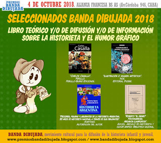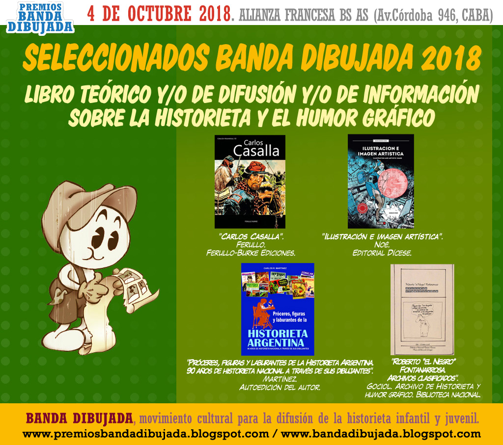 Libro teórico y/o de difusión y/o de información sobre la historieta y el humor gráfico: Carlos Casalla, de Daniel Ferullo (Ferullo Burke Ediciones); Ilustración e imagen artística, de Ignacio Noé (Editorial Dícese); Próceres, figuras y laburantes de la Historieta Argentina. 90 años de historieta nacional a través de sus dibujantes, de Carlos R. Martínez (Edición de autor); y Roberto “el Negro” Fontanarrosa. Archivos clasificados, de Judith Gociol y el Archivo de Historieta y Humor Gráfico de la Biblioteca Nacional (Biblioteca Nacional Mariano Moreno).