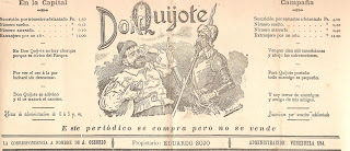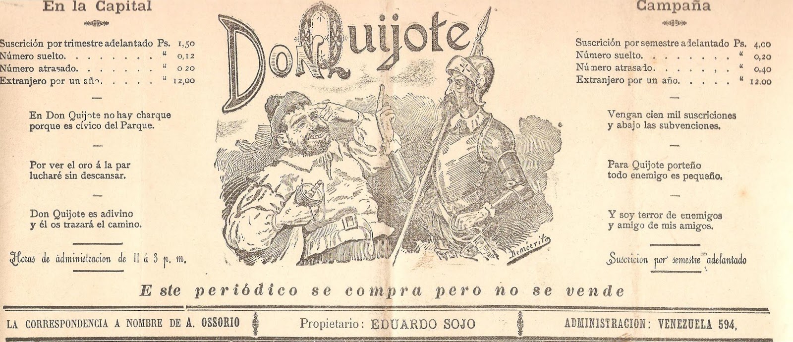 El semanario Don Quijote se editó entre 1884 y 1905 bajo el lema “Este periódico se compra pero no se vende”. Era una hoja de 46 por 70 centímetros, plegada, con texto en las caras exteriores y una ilustración que ocupaba las dos páginas centrales. Aparecía los domingos, con un costo de 12 centavos.