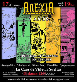 (Información de prensa) Anexia Ediciones invita a la apertura de la muestra de originales Anexia Ediciones 5 años, donde se expondrá el material de las obras editadas, en la Casa de Viñetas Sueltas, Dickman 1260 (CABA), el 17 de marzo a partir de las 19:00 horas.