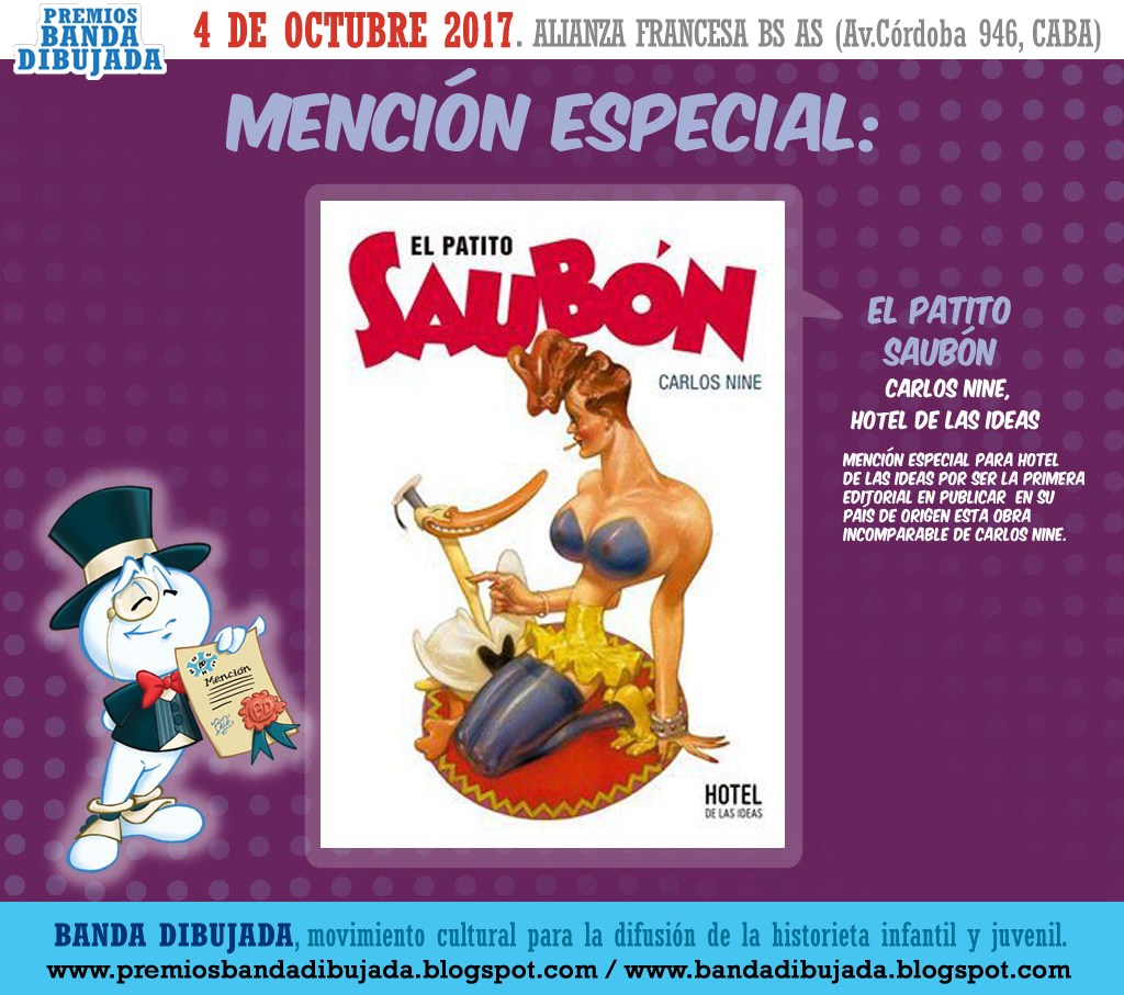 Menciones especialesEl patito Saubón, de Carlos Nine: Mención especial para Hotel de las Ideas por ser la primera editorial en publicar en su país de origen esta obra incomparable de Carlos Nine.