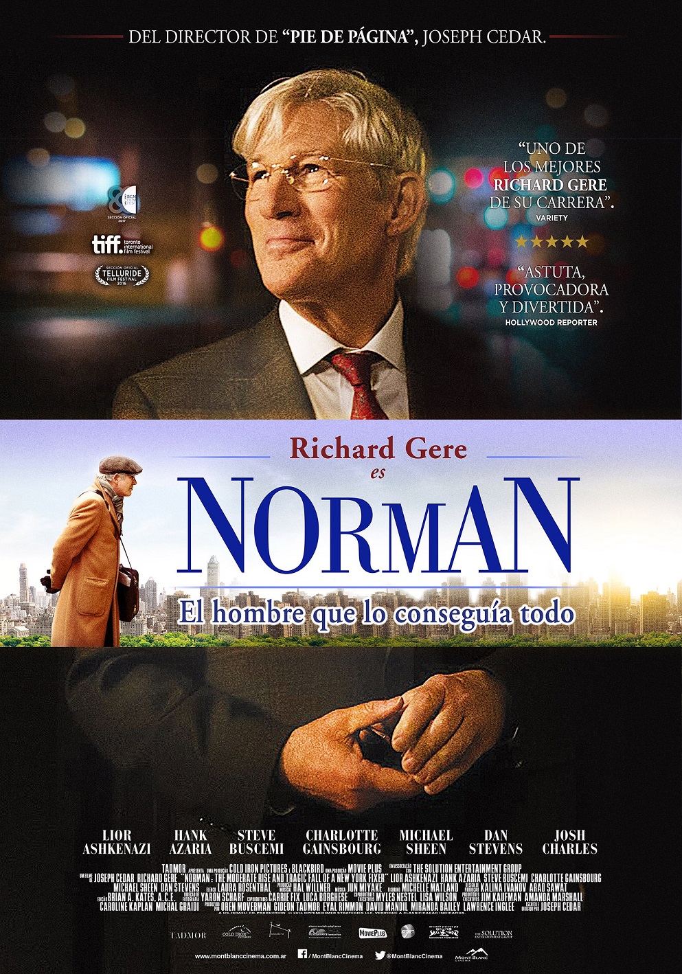 (Información de prensa) Del director de Pie de página, Joseph Cedar, el próximo 21 de septiembre se estrena en la Argentina Norman, el hombre que lo conseguía todo (Norman: The Moderate Rise and Tragic Fall of a New York Fixer, EE.UU., 2016), protagonizada por Richard Gere, Lior Ashkenazi, Michael Sheen, Charlotte Gainsbourg, Dan Stevens, Steve Buscemi, Jonathan Avigdori, Yehuda Almagor, Caitlin O'Connell, Hank Azaria, Harris Yulin, Miranda Bailey, Andrew Polk, Jorge Pupo, Maryann Urbano y Jay Patterson.