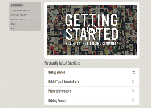 Heya! We’ve updated our FAQ Page w/ a brand new Getting Started video hosted by the hitRECord Community. Also, the ‘Frequently Asked Questions’ section has been updated w/ new info.