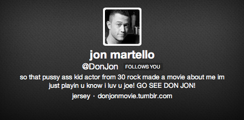 Ladies and gentlemen! I just started a fictitious account twitter @DonJon, and I’ll be tweeting as @DonJonMovie’s flawed but lovable protagonist…