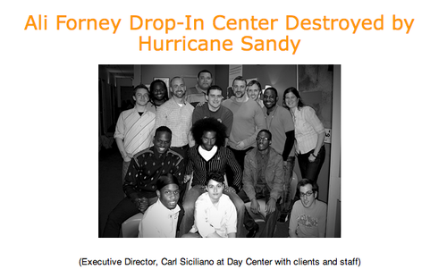 The Ali Forney Center, the largest and most comprehensive LGBT homeless youth organization in the country, suffered a major loss due to Hurricane Sandy. Their drop-in center, which is a lifeline to kids who live on the streets, was destroyed.