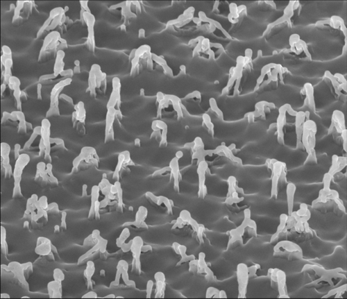 “People on the Beach: That’s what Lim Saw Sing saw in this scanning electron microscope image. Lim, who works at Infineon Technologies’ facility in Kulim, Malaysia, exposed a polyimide surface to etching by reactive ions. The resulting image won first prize at the 2012 IEEE International Symposium on the Physical and Failure Analysis of Integrated Circuits (IPFA 2012). Photo: Lim Saw Sing/Infineon Technologies” Via.
