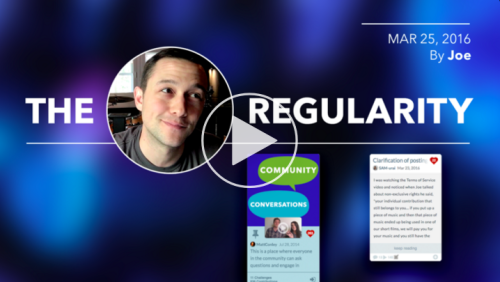 COMMUNITY CONVERSATIONS : Contribute your questions or suggestions in one of the following categories: Creative Projects, Site Features, Technical Questions, Terms of Service, or Miscellaneous. CONTRIBUTE HERE EVERYONE’S REGULARITY VIDEOS : You could recommend a record, highlight a challenge, or turn us on to a certain project we haven’t heard of. Just shoot a video and CONTRIBUTE HERE