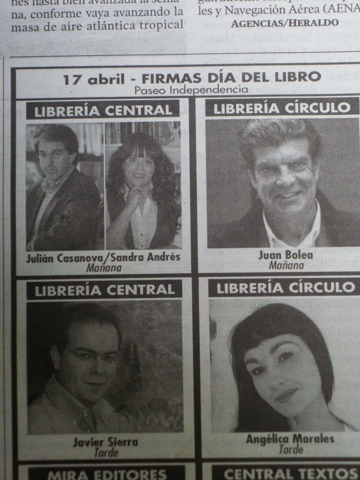 Hoy en Heraldo de Aragón: qué honor, que me hayan incluido con Julián Casanova, Javier Sierra, Juan Bolea y Angélica Morales entre las firmas destacadas para el Día del Libro mañana en Zaragoza.