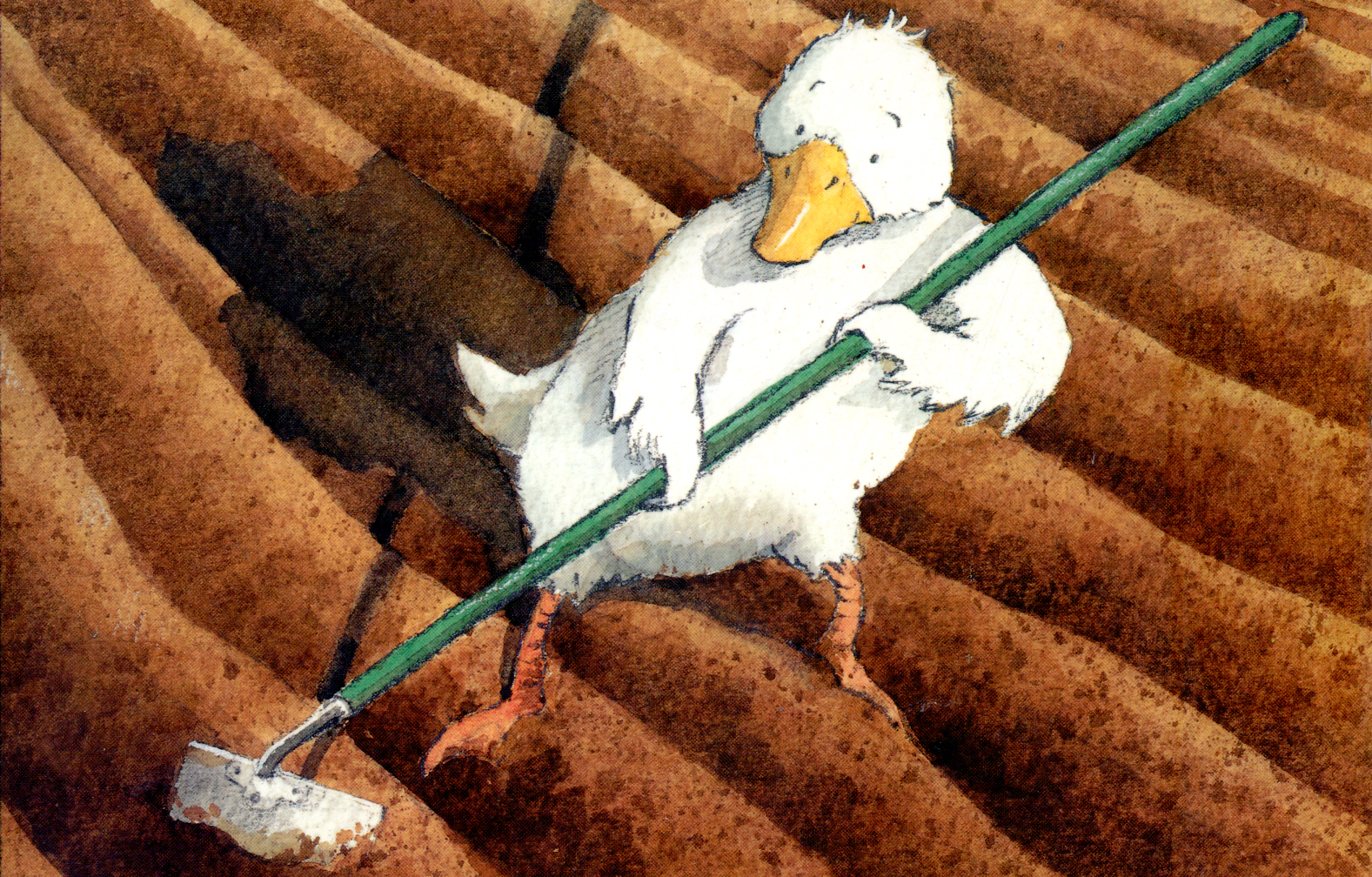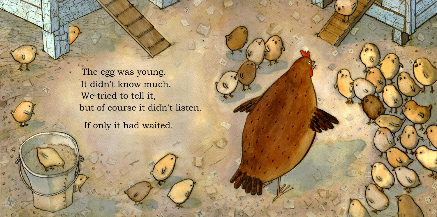 And I’ve been there too. My first book, Egg Drop, is narrated by a chicken and set on a bucolic farm idyll with gently distressed chicken houses.