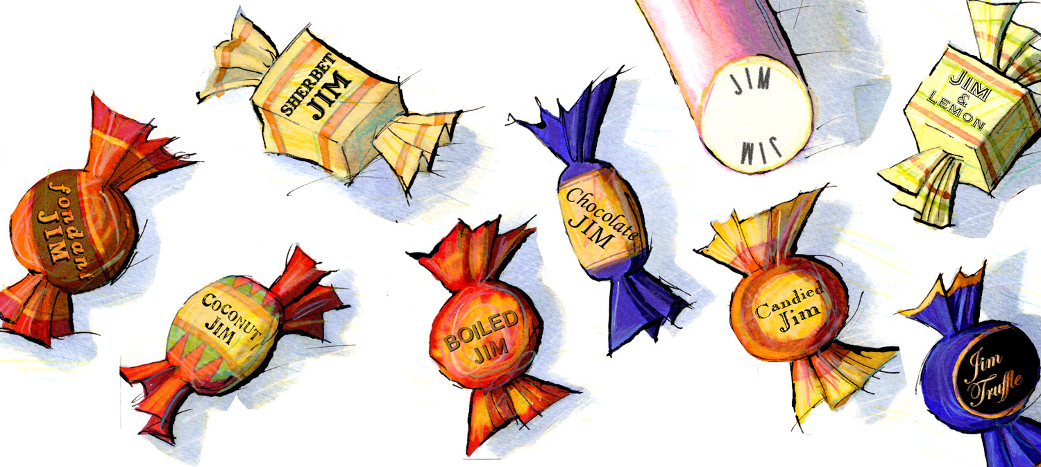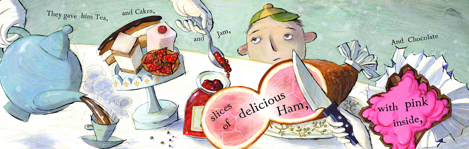 Later I was drawn to Belloc’s Jim (who Runs Away from his Nurse, and is Eaten by a Lion)– it was like a delicious present full of fantastic things to draw: tea and cakes and jam, and slices of delicious ham and chocolate with pink inside. But there’s something about the pink inside the chocolate that might be a bit dangerous, a bit like poison.