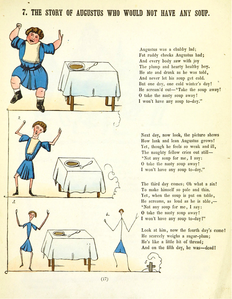 And here is Augustus being reduced from a fine bouncing boy to a stick man in a comic-book type sequence. And it only takes five days without soup to kill Augustus. I think Hoffman was definitely intending to make his children laugh.