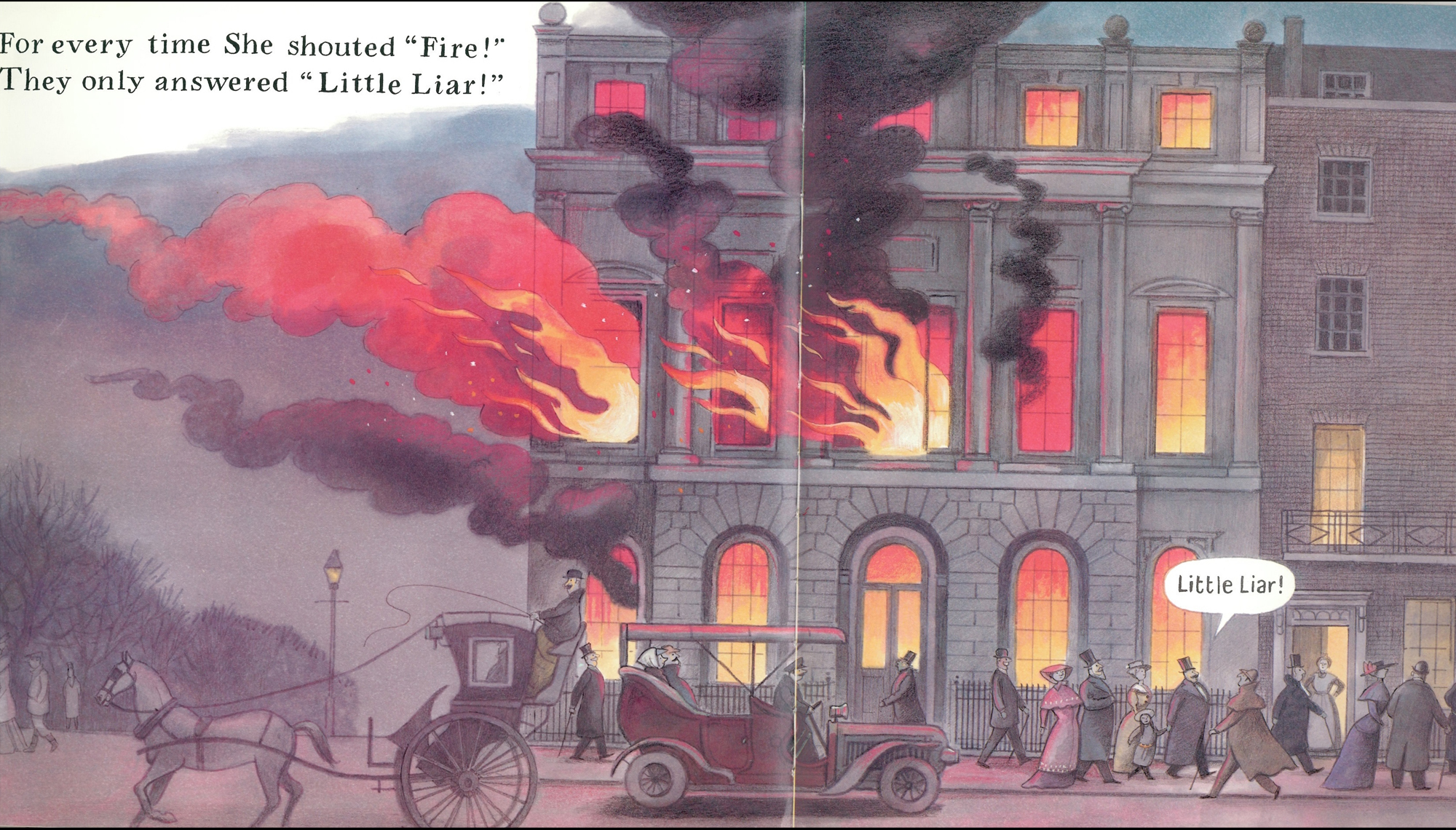 Here is Matilda’s Aunt’s house burning down. It’s such a gloriously elegant inferno. You can have a look at more here: