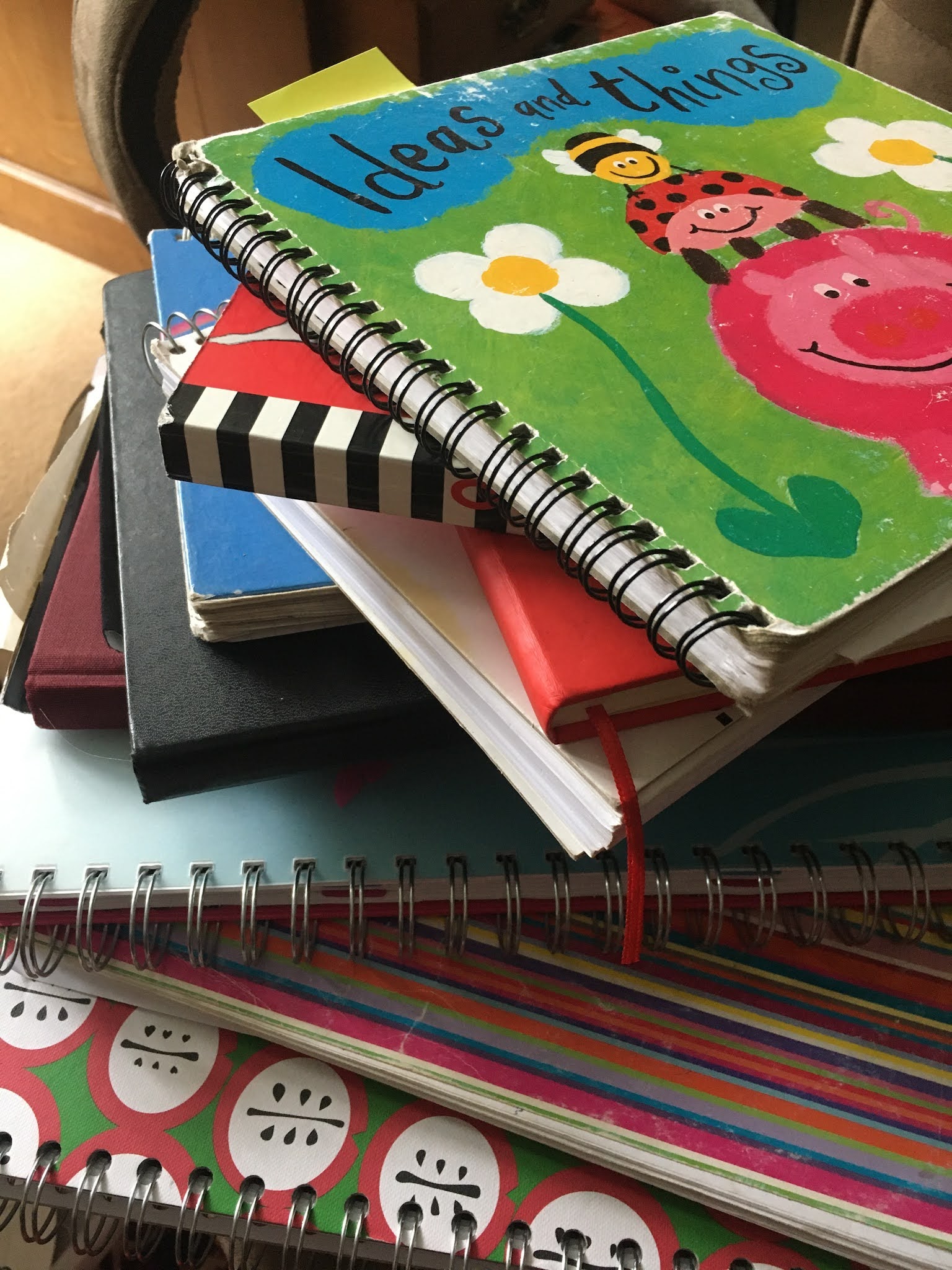 I have LOTs of notebooks filled full of half-baked ideas. I’m not that fussy about notebooks. Some caught my eye, but I’ve been through a lot of cheap spiral bound notebooks. The posh Moleskine one was a gift. Working with paper and pencil feels free-er and more creative than screen and keyboard. There’s something just too neat and tidy and regimented about computer text.