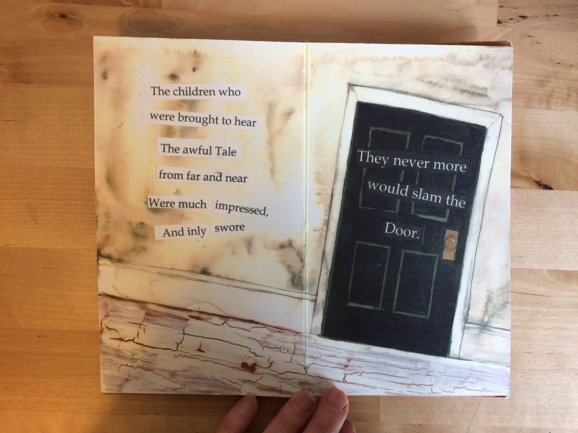 As a child I loved the Belloc Cautionary Tales and learned some by heart – they are brilliant for performing out loud. One of the Bellocs I learned was Rebecca (who slammed Doors for Fun, and Perished Miserably). Ages ago I made a book of Rebecca (for Fun) – I thought a book full of doors could be good. Here are some pages: