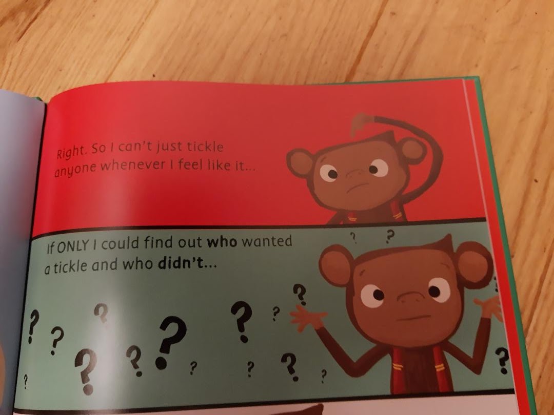 It reminded me of the lightbulb moment in my most recent picture book, Ask First, Monkey! (illustrated by Abigail Tompkins). Monkey gets it wrong time and time again and doesn’t realise what he needs to do in order to work out whether someone wants to be tickled or not.