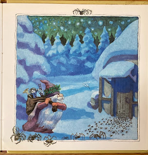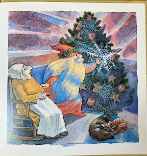 This The Cobweb Christmas version of the story has old German Tante trying to make her home clean for Christmas, sweeping out the spiders. She brings a tree in, and decorates it with cookies for the local children to have on Christmas Eve before Christkindel comes in the night to fill the toes of their shoes. She’s asleep when Christkindel passes by and sees spiderswanting to go in and see the special tree. He opens the door to let them scuttle in.
