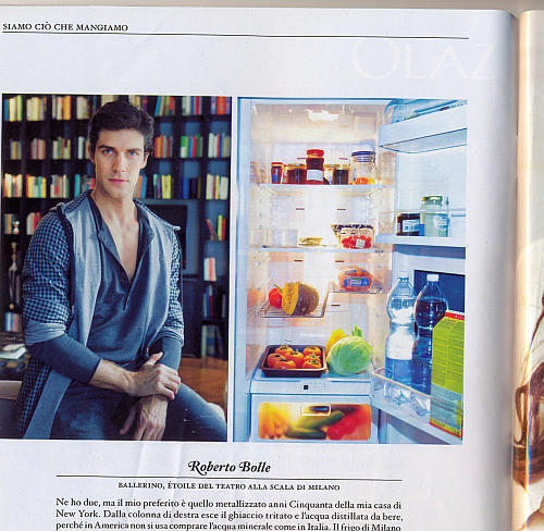 In a recent issue of the Italian magazine Corriere della Serra, Roberto Bolle (along with several other celebrities) revealed the contents of his refrigerators – both the one he keeps in his New York home, and the one in his Milan kitchen. The blogger Gramilano has nicely translated. (Above photo from Gramilano as well.)