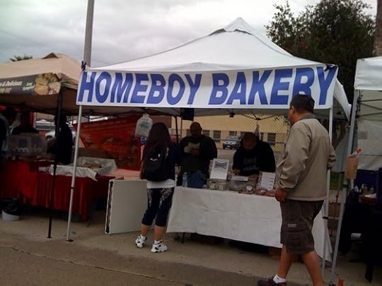 The arts festival coincided with a little farmers market, which I guess happens every Saturday near the subway. I was particularly intrigued by this vendor, Homeboy Bakery, who has several lines of products (bread, desserts, tortilla chips and salsa, etc.) for sale at both farmers markets and in local groceries, and whose mission is to help young people from troubled backgrounds stay out of trouble by keeping them employed with creative jobs.