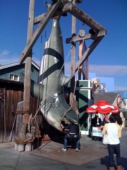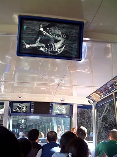 On the ride, they show you via the overhead monitors what the scenes that were shot on the sites you're visiting looked like in the finished movie. Here's a photo of the actor from Jaws messing about with the mechanical shark.
