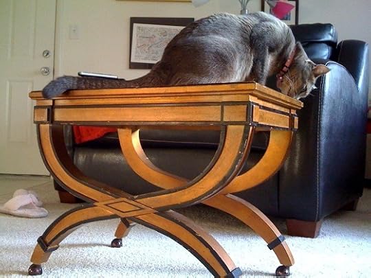 I needed a couple of end tables, so ended up getting this very art deco-looking piece (whose scent Rhea has approved),
