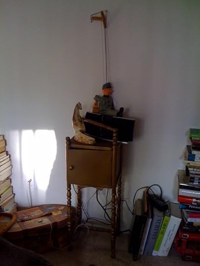 and, though I really have no idea what it is, this piece. All I know is it's small and has an ornate top handle for carrying that matches its legs, and it has a little door that opens up and provides a little container for books, or in my case a CD player and old CDs. I thought it was fun and very very old.