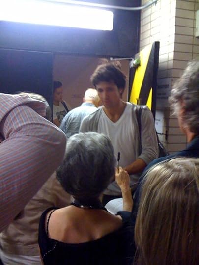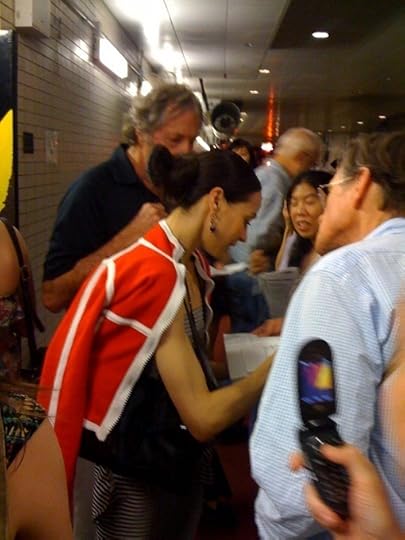 I didn't actually go to the Friday night performance. I watched the David Michalek slow motion films out on Lincoln Center Plaza (more about that later). But I'd planned to meet ballet-goer friends anyway for late dinner. At the stage door, several of the dancers came out – including our Diana Vishneva, who danced Carmen that night – but everyone (a mix of women, men and teenagers of both sexes) seemed to be waiting for someone in particular. Finally, at the tail end of the string of exiting dancers, he arrived. Vladimir Shklyarov. I knew he was the one everyone was waiting for by the outburst of giggles was followed by a mob-like rushing of the poor guy. Since I hadn't gone to the performance, I wondered what was so great about him. He seemed like an ordinary guy. He seemed very American. He was wearing his hair in that kind of mussed-up style that is trendy here right now. And he was wearing American style jeans with the low-pockets, suede loafers, and a button-up shirt with the collar up at the top, preppy-like. And when he spoke (at least as much as I heard him), he seemed to have only a trace of a Russian accent. Seemed like a very nice guy.