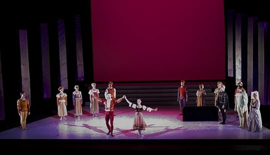 I also wasn't too enthralled with the Mariinsky's Carmen Suite, choreographed by Alberto Alonso. There was a big round mat in the middle of the stage where the dancing – most of it by Carmen alone, some of her dancing duets with men – took place. There were chairs setting on a raised platform that encircled the mat, and the men sat on the chairs and watched her. My Carmen was Ulyana Lopatkina (who was also my Anna Karenina), and her dancing to me looked, in Carmen, very gymnastic. But I think it was the way the stage was set up – it looked like a gymnastic mat – and she kept doing these standing poses that reminded me of a gymnast about to take off in a tumbling pass during a floor routine. It was another ballet that didn't focus so much on recounting a narrative than creating a feeling, a tone, through vignettes. It worked a little better here than in Karenina, maybe because it was a shorter piece, but I think the gymnastic thing, and the overall creepiness of the men sitting in their chairs just watching her, didn't really work for me.
