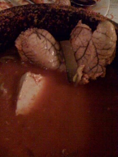 Despite the heatwave, last night my friend and I went to Koreatown for some Korean barbecue. I ordered a dish that looked interesting, which was translated as "Codfish caviar and clams." Hehe, my friend surmised that perhaps caviar meant the entire reproductive organs of the fish. I looked again. It was rather veiny, did kind of look like a uterus and ovaries. It certainly wasn't what I was expecting – which was roe about the size of salmon! I tweeted a picture and a Twitter friend told me they actually are eggs, along with the egg sac. His father has them all the time, he said. Funny, I thought I'd tried practically everything, but apparently not! Anyway, they didn't really have much of a flavor to me, but their consistency was similar to English pudding.