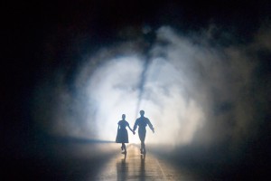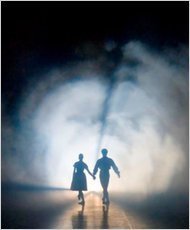 According to the program notes, Coppelius is a seducer, not at all the silly wobbling clown from the American productions. He tries to seduce Swanilda, who seems, from what I could tell of the onstage action, to be a bit taken by him, but only to a point. She and her girlfriends break into Spalanzani's toy factory, play with the toys – like in the American productions – but then Swanilda sees how taken Coppelius is with the outline of the doll Spalanzani is in the process of making, and for some reason, she decides to don the doll's costume and dance for Coppelius. It's unclear whether she is pretending to be the doll come to life – her movements aren't at all doll-like, as in the American productions. But at one point, things get too serious, Coppelius gets too impassioned with her, and she runs off, somewhat afraid of him. Then she accepts Frantz and the two end up together, their silhouettes wandering off into the tunnel of light, as in the photo above.
