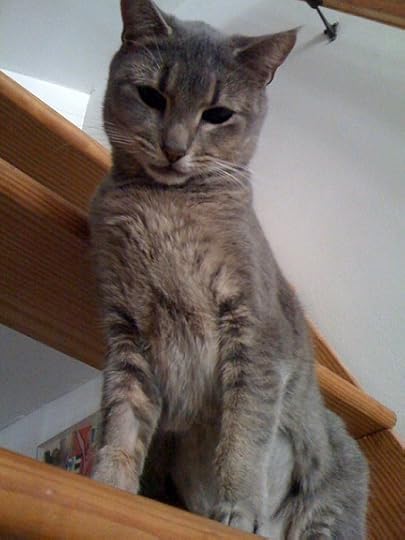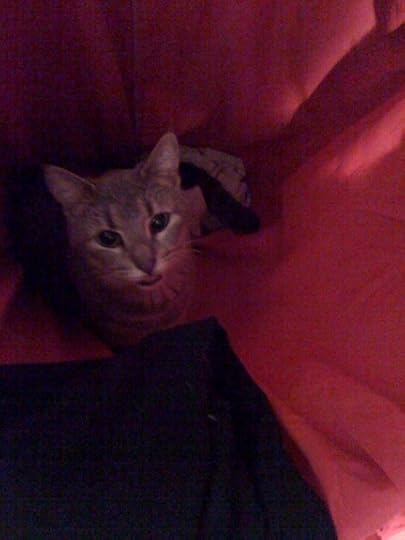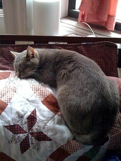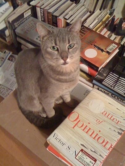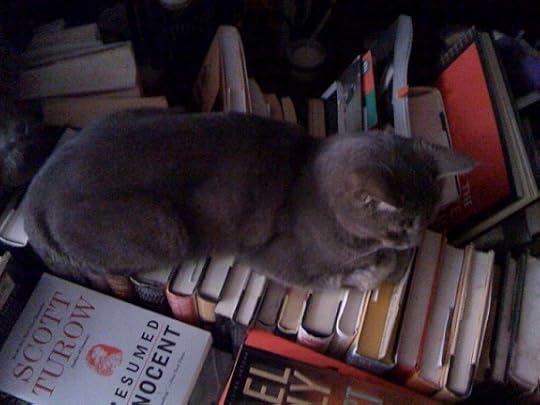 She sleeps in the oddest places, like on top of the book spines. A copy of Swallow was on top of Turow's Presumed Innocent. She apparently thought nothing of smacking mommy's novel down to make herself a little step to her "bed."