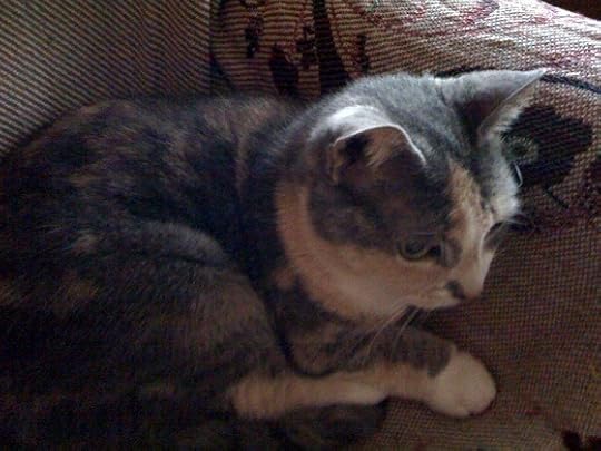 Katy. Once a farm cat, she's become an indoor kitty since moving out of the country and into town. She's very sweet but she always refuses to look into the camera when getting her photo taken.
