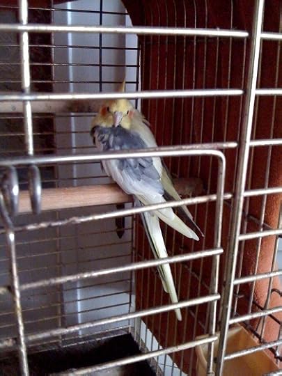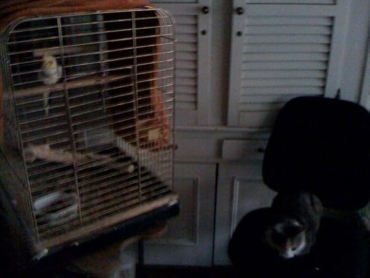 Cat and bird seemed to get along quite nicely. At least that's what kitty led me to believe… Twice when the bird flew off his perch to have some birdfeed, I found kitty suddenly sitting up all alert and ready to pounce…
