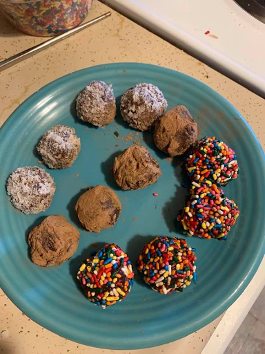 8. Take out and scoop with regular teaspoon into small scoop and either roll it in the palm of your hand, or drop it as it is into the powder sugar, sprinkles or whatever it is you're going to dip it in.