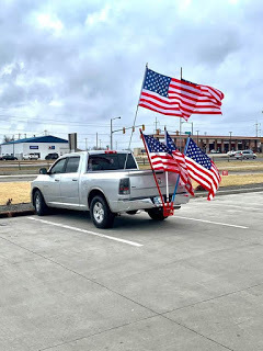 Mr. Patriot was about 6'2" tall, weighing in at somewhere between 215 and 230 pounds. He had a clean-cut but his face was majestically hairy - - we're talking several inches of free-flowing beardedness - - I gave this man a head nod and said "Thank you" out loud in front of God and everyone. I pointed at his gun when I said it. I asked him if the truck outside with all the American flags flying all around it was his truck. He stated it was not, but that he had seen it, and wanted to know where he could pick up a three-pronged flag holder for his truck's bumper! I thought maybe BassPro would have it, but I'm sure he can order it. I don't have a truck - - but the free-flowing American flags draping and cascading are fabulous representations of how my heart felt when I watched the man walk into Winco without his mask. THANK YOU AGAIN, Mr. Patriot. It gave me the courage I needed to put my mask back into my purse, and of course, Laura followed suit.