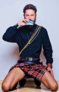All that being said, and I could go on and say so much more, but I won't; I prefer the hairy big bearded brutes to the skinny boys (or men) wearing tight jeans, scarves, polos, whatever - - crocs. Give me black boots on a man; hell, he can be barefoot as long as he's bare all over - - did I say that out loud? Stop already! OK, OK, OK...so he shouldn't be naked, he should have clothes on to keep him warm, and if he's at the gym or walking into the store he would definitely need to be wearing something so let me see, what on Earth could I possibly put on this new fantasy man that would make him more...ahh, I know, a kilt. That's it! He's ready to go! I didn't say he had to attract you or anyone else did I? Nope, his entire mission today, tonight, tomorrow, the next day, and every day after that in my dreams is to attract ME and only me, and he can do that wearing his kilt...and black boots. I do like black boots, maybe unlaced, maybe holding a cup of coffee, but yeah....that. So sue me, I have a type.