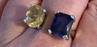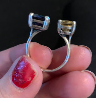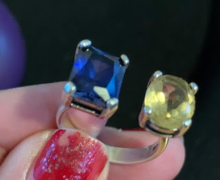 The ring is simple: two stones, blue and gold. They are placed in sterling silver, a good working metal, not a precious metal, but a solid one. The blue stone is square and represents the man. He is a man, he is mostly square. He is blue. He's always been blue. I am gold. I have always been gold. Because I am a woman, my stone is round. Most women are rounder than square. We are separated by time and space, but we are connected by Christ. The ring is a perfect reminder of my promise to God, His promise to me, and my commitment to pray for my friend.