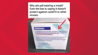 Up to now, I've basically just stated my opinion to myself, to friends, to people who may or may not specifically ask me what my opinion is on masks, but now I really do have to make a stand publicly and say that the blue (non-surgical) masks that most people are wearing, as well as most (if not all) of the homemade cloth masks simply do not protect anyone (you, me, or the next person) from either COVID-19 or any other virus that may be floating around in the air. You know it, even if you don't want to admit it, you know it. It says so RIGHT ON THE BOX.