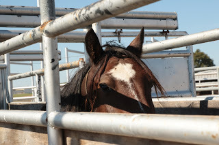 Among the throngs of younger horses in corrals lining the west gates I found myself leaning against the rails of the pipe fencing separating the 2-4 year old geldings from the 5 years and older geldings; a group most people avoid as the older a feral horse is some say the harder he (gelding) is to train. A mare is often stubborn to the point of being untrainable, but usually they're good up into years 8-12 to be honest. Feral Mustang geldings (and definitely studs) typically refuse to be trained after about the age of 6 really, anything older than that and you'll have to really put in the time if you want to create the bond needed to fully train one. I stood on the outside of the pipeline fence and just behind me stood the full figured body of a 1200 pound bay gelding, much larger than most. Aged 6 years, standing at 15.3 hands (63 inches) this guy was a sight for sure. Before I knew it he had his head completely resting on top of my shoulder over the top of the fence, and he was literally snorting into my left ear. It sounded a lot like "Hey, I know you don't really know me, but I would really like to get out of this place and maybe, I don't know, go home with you." (If you don't believe me you can ask him for yourself. That is exactly what it sounded like to me.)