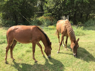 I had already decided I wasn't and couldn't name the horse Mora, it didn't suit her. I liked the name Ava, and Angie liked the name Georgia for her new little (big) mule baby. When they arrived both were skinnier than they had appeared online, it had been an older video I think. They were certainly under weight and sad from stress and sickness. It's taken Angie and I (and my daughter Laura) a good month now to get them fatter, dewormed, clear from a bout of strangles, which can be described as snotty nose, throat, and eye discharging, leading to lesions that open up on the throat and under the neck to drain. It's disgusting and can be deadly if not cared for immediately. Georgia had it the worse, being a baby, but my sweet Ava was affected as well.