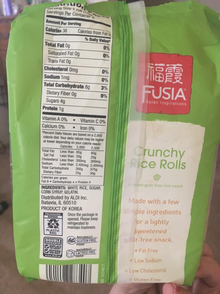I bought rice cakes, but they're really more like rice rolls, little tubes from ALDI and I have to say, they are fantastic! I don't even know their calorie count, I need to look it up, but my guess is 10. Let me go look now and see if I was right. I was wrong, 38. Still fantastic. They help with the need for something crunchy, they help with the need for a tiny bit of sugar (4g), and they help when you think you're hungry, but really you aren't. They don't fill you up, but they can hold you over until the next actual meal. I am all about grazing, as grazing throughout the day can help reduce calorie intake at meals, and keep your satisfied so you don't load up on empty stupid calories and fat. These little rice rolls are awesome. If you can't find them, get rice cakes instead. VERY good choice.