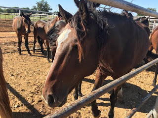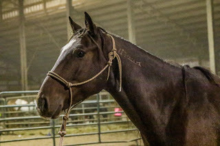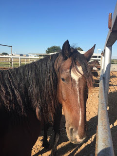 Once at the Pauls Valley BLM area #2979 was taken to two more places to be seen and examined by would be adopters. Though he would stand taller than most American Mustangs at 15.2H, and he had both back "socks" of white, as well as a star, stripe, and white snip on his dark bay face, he was not chosen at either. Perhaps it was the hump back that kept him from being picked, or perhaps the BLM had grouped him with more flashy horses and not enough adopters had shown up to pick him on either occasion. I like to think that God had other plans for Norman, and that he was saved for the day I would happen to ramble onto the premises this past October 11, 2016. I think Norman knew something was up before I knew, but however it happened, it did in fact happen, and before the adoption-ending noon bell rang, Norman was being loaded onto a trailer and being carried off to be trained by a professional TIP, or Training Incentive Program trainer. He was adopted by ME and he was no longer a wild horse. He was on his way to being...well, domesticated.