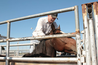"Hi, I'm Tim Brock", said the quiet man now standing in front of the larger than life horse who was refusing to release me from his gaze. I introduced myself, and listened as Tim explained that for the past few minutes he was considering taking #2979 as a TIP horse either for Jeff, the man with the sling, or just because, as he felt that the horse had more potential than others. He hadn't made up his mind, but he was thinking about it. Lauren, his step daughter, who is also a TIP trainer, had a few others in mind, and the boring big bay gelding wasn't one of the ones she wanted. Jeff didn't want him either, he was too big, and there was that hump or high wither that didn't interest him. Laura, my own daughter, laughed at me and said, "You know, you already have your adoption application in the BLM system, so you could take him." I smiled. I didn't do more than that, but I did smile. It was then that Tim explained to me how the TIP program worked. Seems he was being paid by the Mustang Heritage Foundation to train qualified horses at the BLM; ones who would then be adopted. If I wanted Norman, or as he was named #2979, all I had to do was say so. Tim would take him to Missouri where he lived and operated, train him for two or three months, and bring him back all ready to go! It would only cost me $125 to adopt, and whatever to bring him home, but since he'd be back to pick up others, it shouldn't be much.