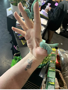 While I waited for Laura to pull out her credit card and buy Mervin for me, I found my right hand unoccupied. I decided to stick it wrist deep into a big bowl of blue-horned worms at the front of the store to entertain folks and give them something to look at and talk about. I asked permission before I picked them up, but you haven't lived until you let fifty to sixty big fat sticky-footed worms crawl all over your hand while you wait for someone you love to pay for the Komodo dragon in your other hand. That was my day.