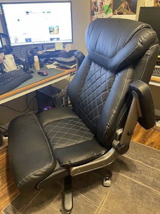 The new chair has a natural tilt to it, so I sit in it, and my rear end is in a sort of "V" with the leg rest under my thighs being slightly higher than the last chair. It's also ergonomic, and I can feel the difference. I am absolutely relaxed, and don't want to get back up out of my chair - not always a good thing; I will admit that. I literally found myself today, while on the phone, sitting back, chillin' just relaxing, letting the person on the other side of the phone talk and complain. I typically stop them. I usually bring them back to the core of the reason I called, which is for them to pay their damage claim.